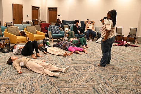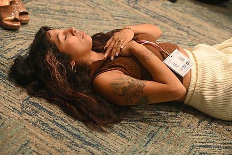 Recently I led a group of women and femmes of color through integrative practices of release and rest in the form of somatic movement, breath work, and yoga nidra. As this was the final session of a conference, it became clear that I needed to aid in connecting a through line of all the topics while giving folks tools they could use as they move about the world as female-bodied professionals. I say it that way, because the set of assumptions on the female-presenting body are coded with relationship between privilege and proximity to power, roles enshrined in a patriarchal society, and the stories we hold of others’ stuff (stuff = stories, needs, trauma-dumping, familial obligations, etc. ad nauseam), and we do all of this while trying to continue to educate ourselves, be great romantic partners, participate in integral ways in our community, and pay MF bills… while democracy is failing. Where do we expect all of that to go if not the body? This is the reason why movement practices are essential. Yes, we do the work of self study and surrender, we commit to the work of collective liberation, possibly, and we become advocates for ourselves, our families, and our communities, but when the fuck do we rest and lay all of that down? And is it rest or is it dissociation? Can we rest with awareness and can our rest be skillful?